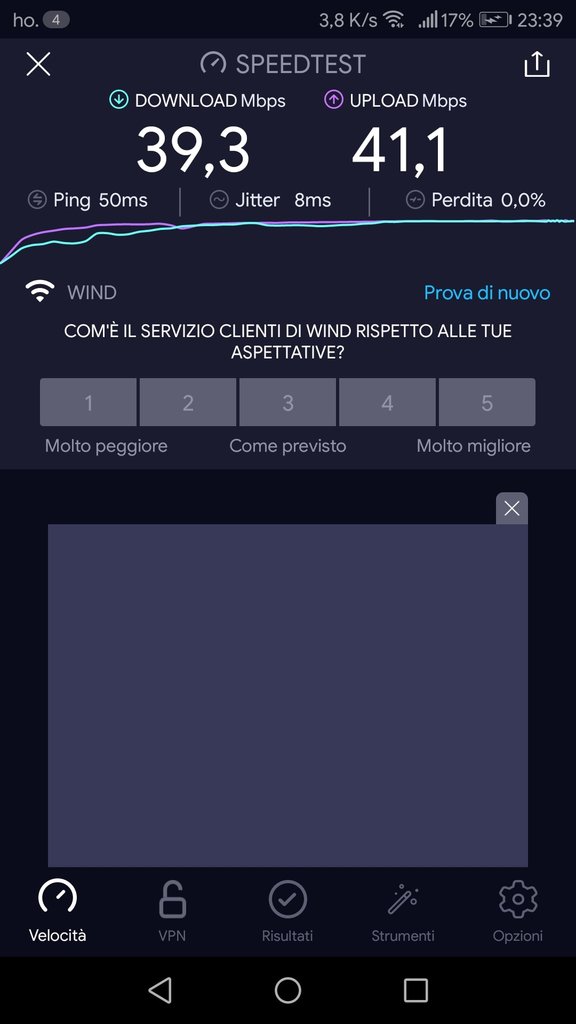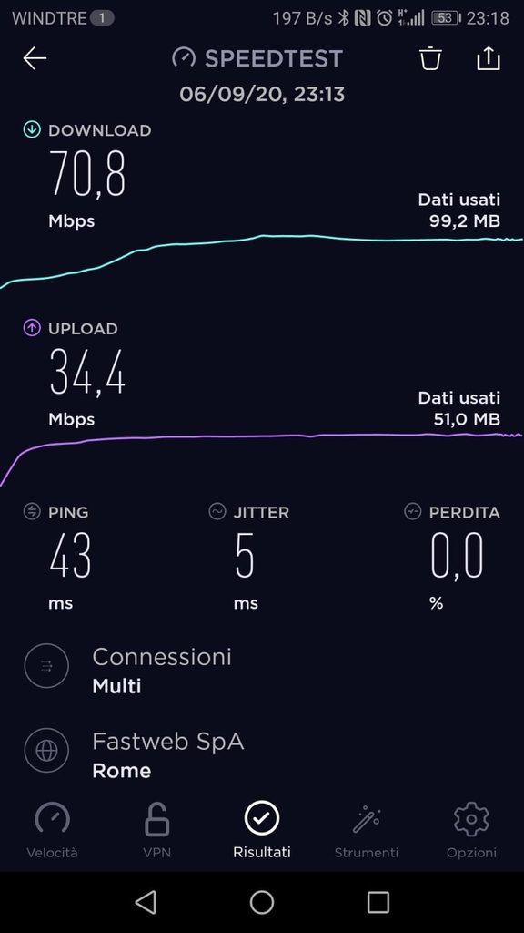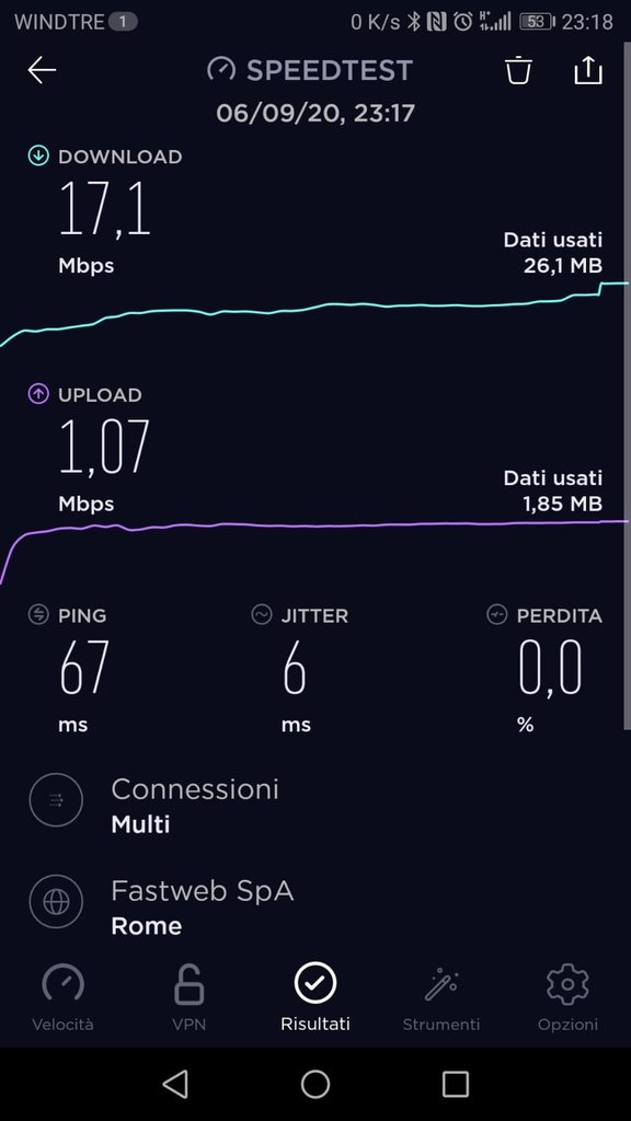 Buonasera a tutti stasera ho appena fatto degli speedtest tramite sim windtre su uno smartphone Huawei p8 lite 2017.