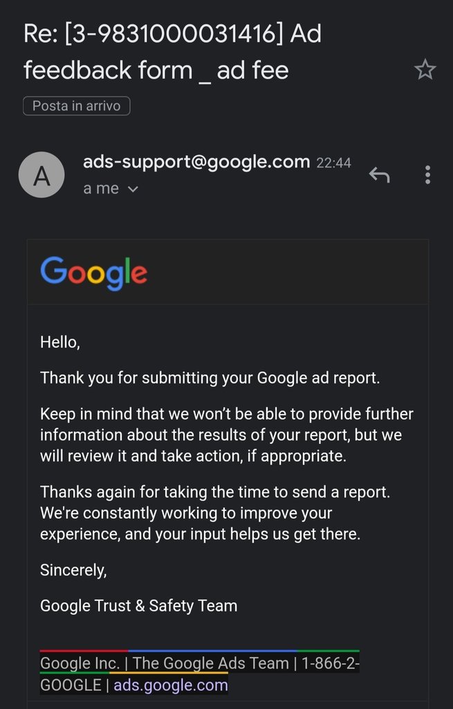 Eddie Dopo aver trovato 2 annunci di fila dello stesso sito in una discussione (contenuti pornografici) ho mandato immediatamente una segnalazione a google. Questa è la risposta: A quanto pare non ci possono fare molto...