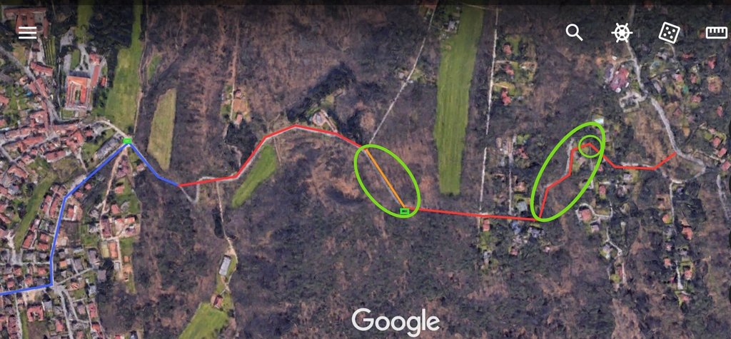 Situazione attuale: i cerchi grandi verdi rappresentano le tratte che mancano, quella a sinistra perché bisogna fare no-dig o trincea, quella a destra perché bisogna passare su proprietà privata e il resto è in curva e in salita, difficile da fare.