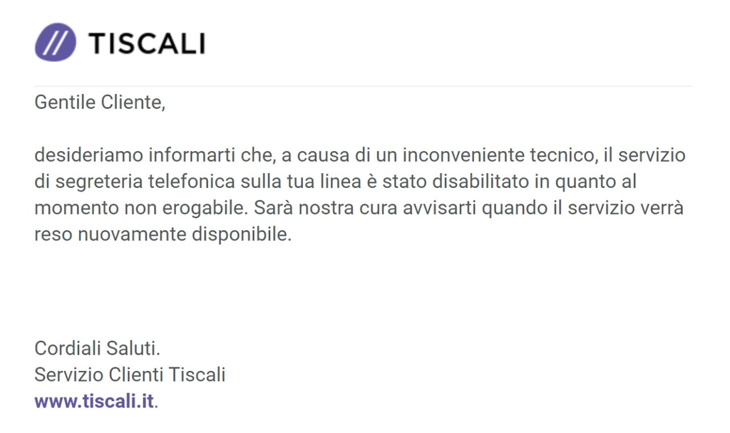 Già da alcuni giorni l'opzione Segreteria Telefonica non è più disponibile sottoscrivendo le offerte Tiscali di rete fissa.