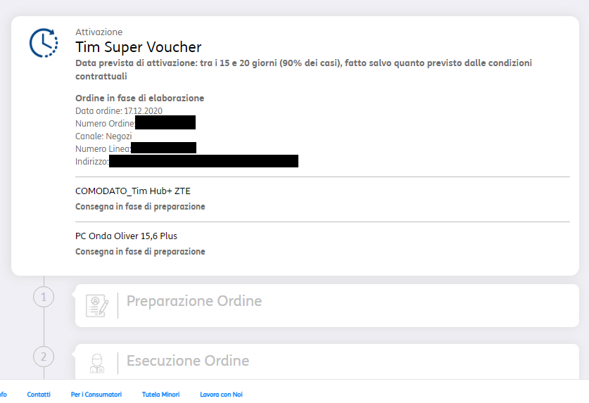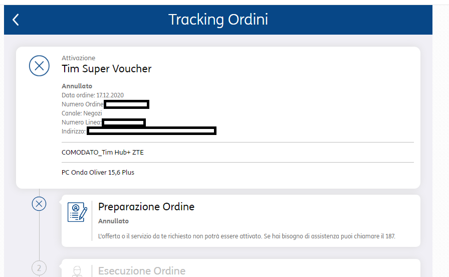 Fittl LoreBlack ok allora ci sono pratiche che vanno avanti e pratiche che per qualche motivo rimangono bloccate. Infatti una volta chiamando al 187 mi è stato detto che la mia pratica era una tra le tante che risultavano bloccate. Si su my tim riportava "Preparazione ordine" quindi la fase 1. Comunque ti ringrazio per il tempo dedicato😉