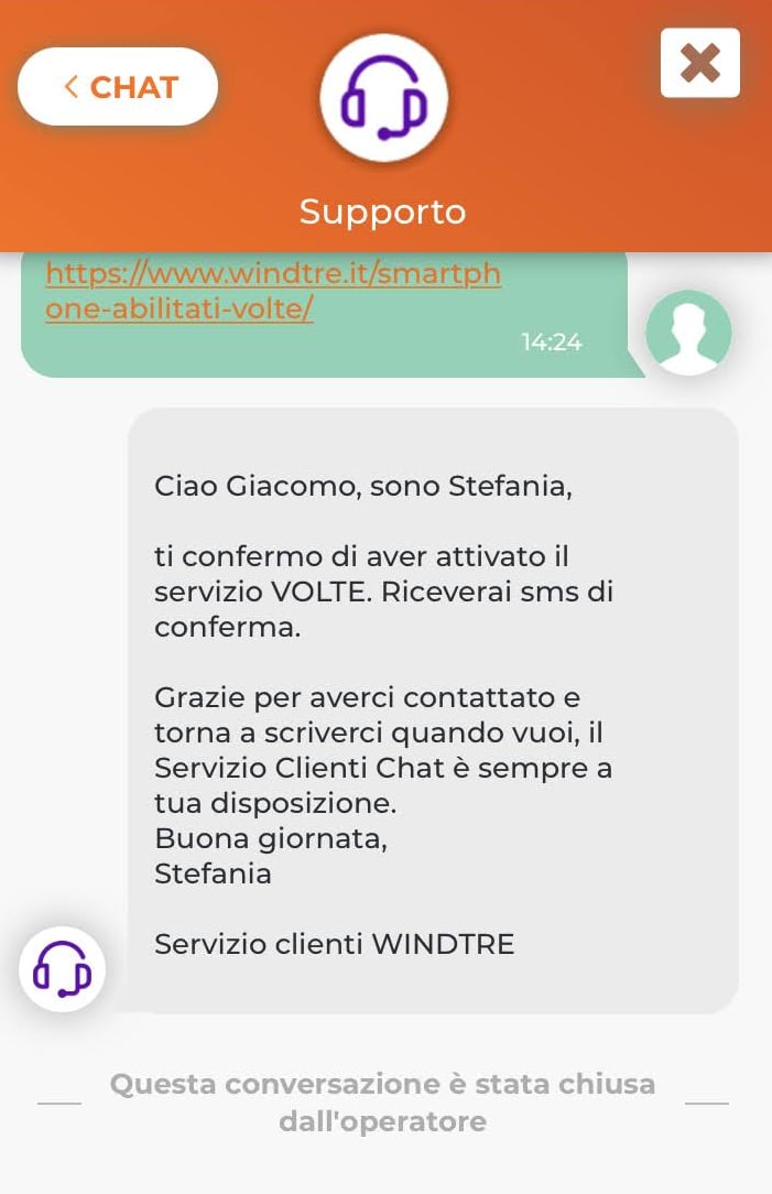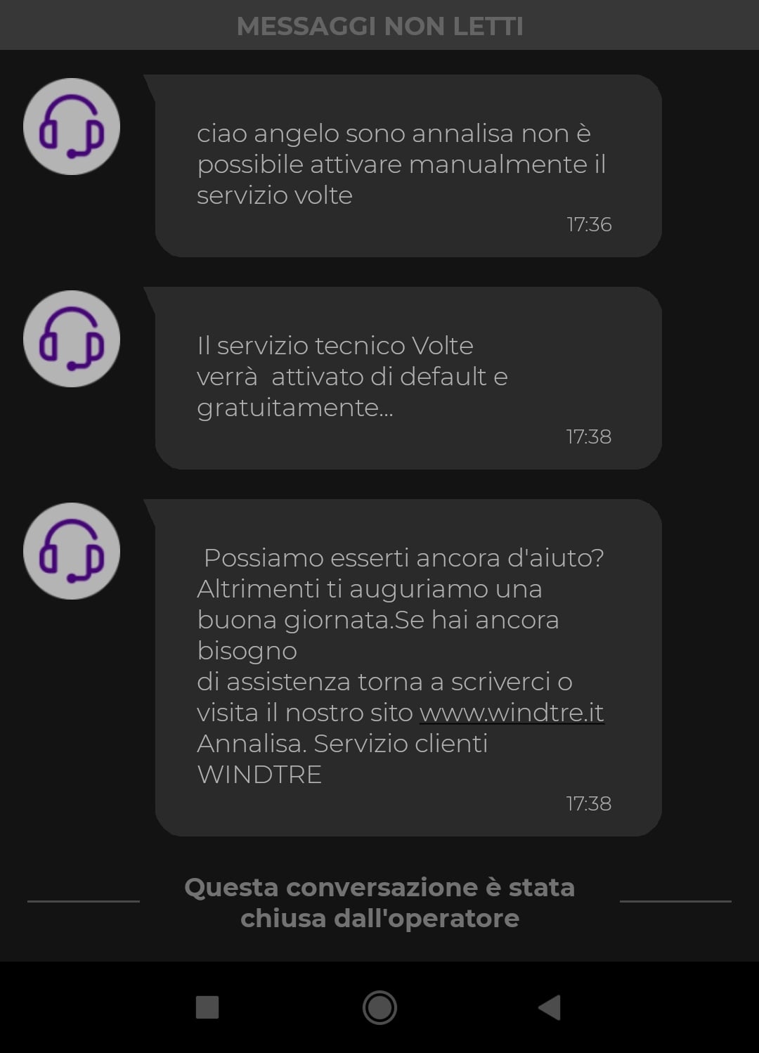[cancellato] Angelo_V Confermo che l'assistenza 159 non è autorizzata all'attivazione del VoLTE e che la stessa avverrà automaticamente rispettando le condizioni essenziali: dispositivo certificato (lista consultabile sul sito WindTre) e SIM Wind/WindTre/H3G softmigrate. Per questo motivo trovare chi lo fa è come trovare un ago in un pagliaio. Hanno deciso di limitare le attivazioni forzate durante il periodo in cui VoLTE generava solo problemi ed è da allora che non lo fanno più facilmente su richiesta.