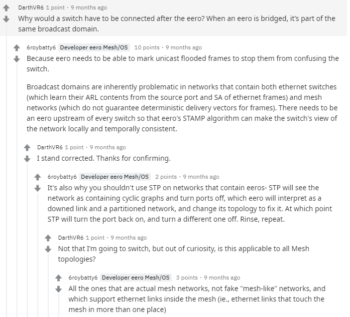 Ho scoperto che va impostato così per permettere a uno degli eero di gestire la mesh, il roaming e il seamless handoff, cosa che non è possibile se sono collegati tutti e tre allo stesso router/switch.