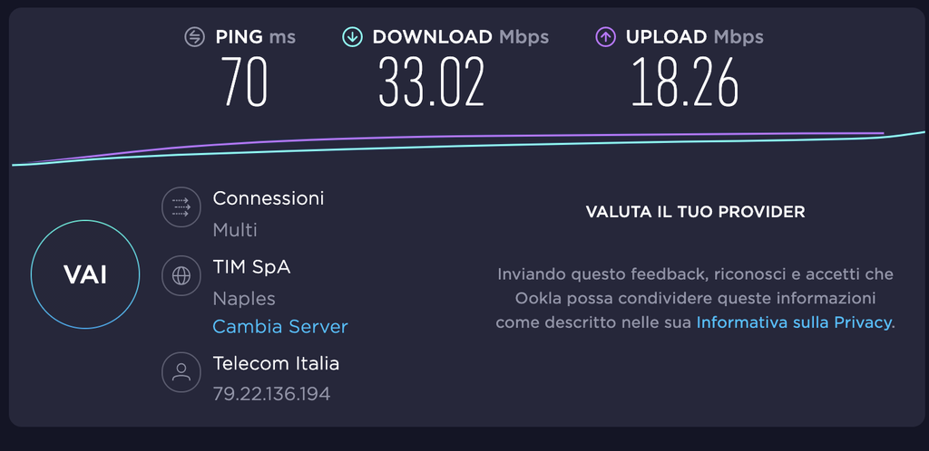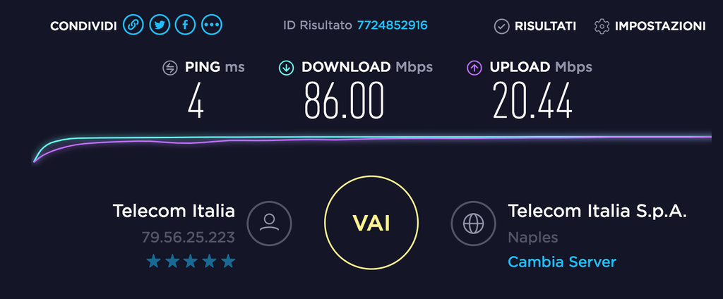 Ho spento il modem e riacceso dopo 5/10 minuti e i valori sono ritornati quelli di sempre però dopo qualche minuto rifacendo lo speed test crolla tutto e il ping risale alle stelle.