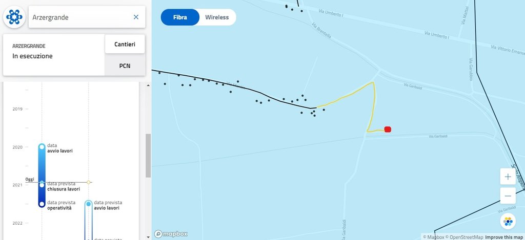 La mia speranza era, a questo punto, di aspettare la FTTH e di concludere i miei problemi con internet, e in queste settimane mi accorgo, che nella mia piccola città, oltre ad aver messo la FTTC, stanno mettendo anche la FTTH. Ero contentissimo finchè non vedo questa schermata... io abito nel puntino rosso e come vede NON mi arriva la FTTH, ma è distante SOLO 400-420 metri (linea gialla).