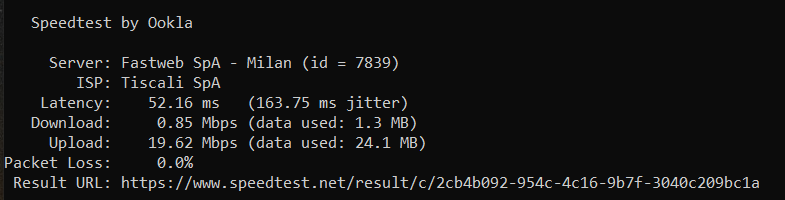Mentre di solito la notte cadeva la PPOE e la mattina ero forzato a riavviare perché rimaneva la spia rossa sul simbolo di internet, stavolta non è caduta, tuttavia la velocità è calata fino a sotto al mega in download e 20 regolari in upload (speedtest fatto con CLI e cavo ethernet).