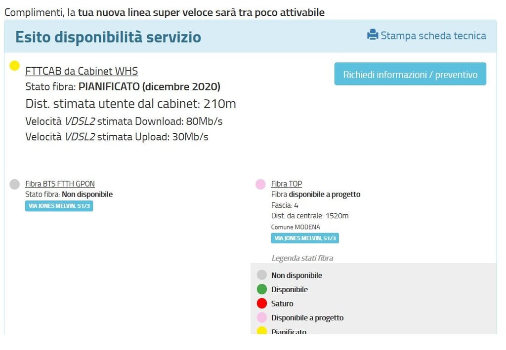 attualmente nella mia zona, periferia estrema di Modena, e' disponibile ADSL 20 MEGA ma nel sito BUL viene indicata una FTTH e nel sito Planetel una FTTC pianificata a Dicembre 2020.