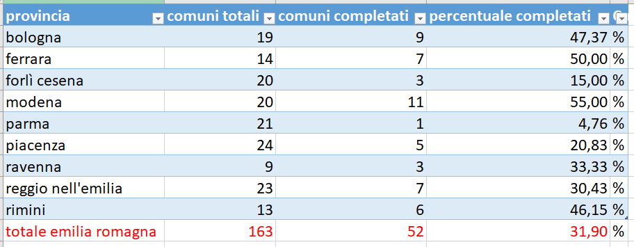 Per comuni completati si intendono i comuni con almeno lo stato cantiere "lavori chiusi", vediamo che fanno molto bene le province di Modena, Ferrara, Bologna e Rimini, arranca invece la provincia di Parma con quasi il 5%.