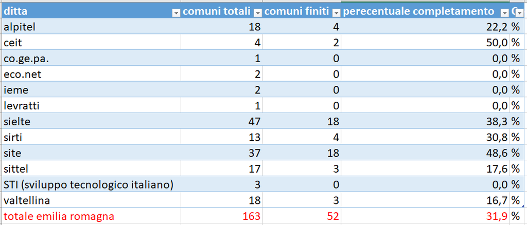 Per il computo ho preso solo i comuni che al 1 Dicembre sono in stato "Aperto" o superiore, cioè ai quali è stata assegnata sul sito di OF la ditta esecutrice.