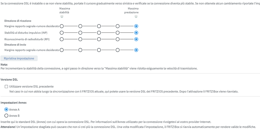 Ho provato a passare tra Annex A e B, le disconnessioni rimangono, ho abbassato gradualmente fino a "Massima Stabilità" tutte le voci, le disconnessioni rimangono, l'unica cosa che non ho provato è usare la versione DSL precedente, potrebbe essere quella?