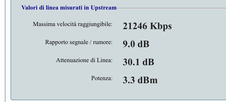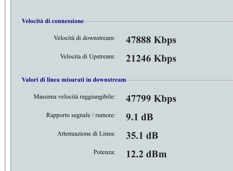 Buonasera, ho un contratto con fibra fttc 100/20 con Wind, da sito fibermap mi segna distanza dal armadietto di 210 metri. Riscontro una portante di circa 50 mbps in down e 20 in up (allego sotto delle statistiche del modem). Vorrei chiedere se gentilmente qualcuno potesse aiutarmi a capire come potrei fare per migliorare la velocità. Aggiungo che ho provveduto a sezionare l’impianto telefonico collegando il doppino bianco-rosso con dei mammut ad un altro cavo che va ad una presa a cui è collegato il modem (non sono un esperto, ma ho provato a seguire al meglio la guida che si trova sul sito).