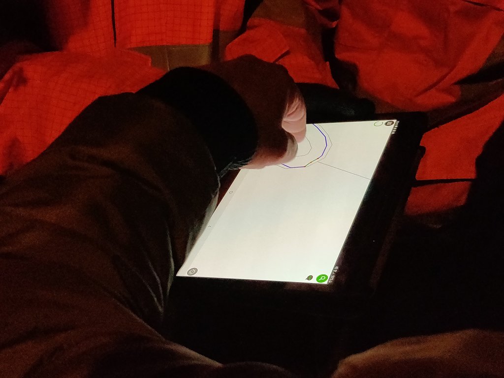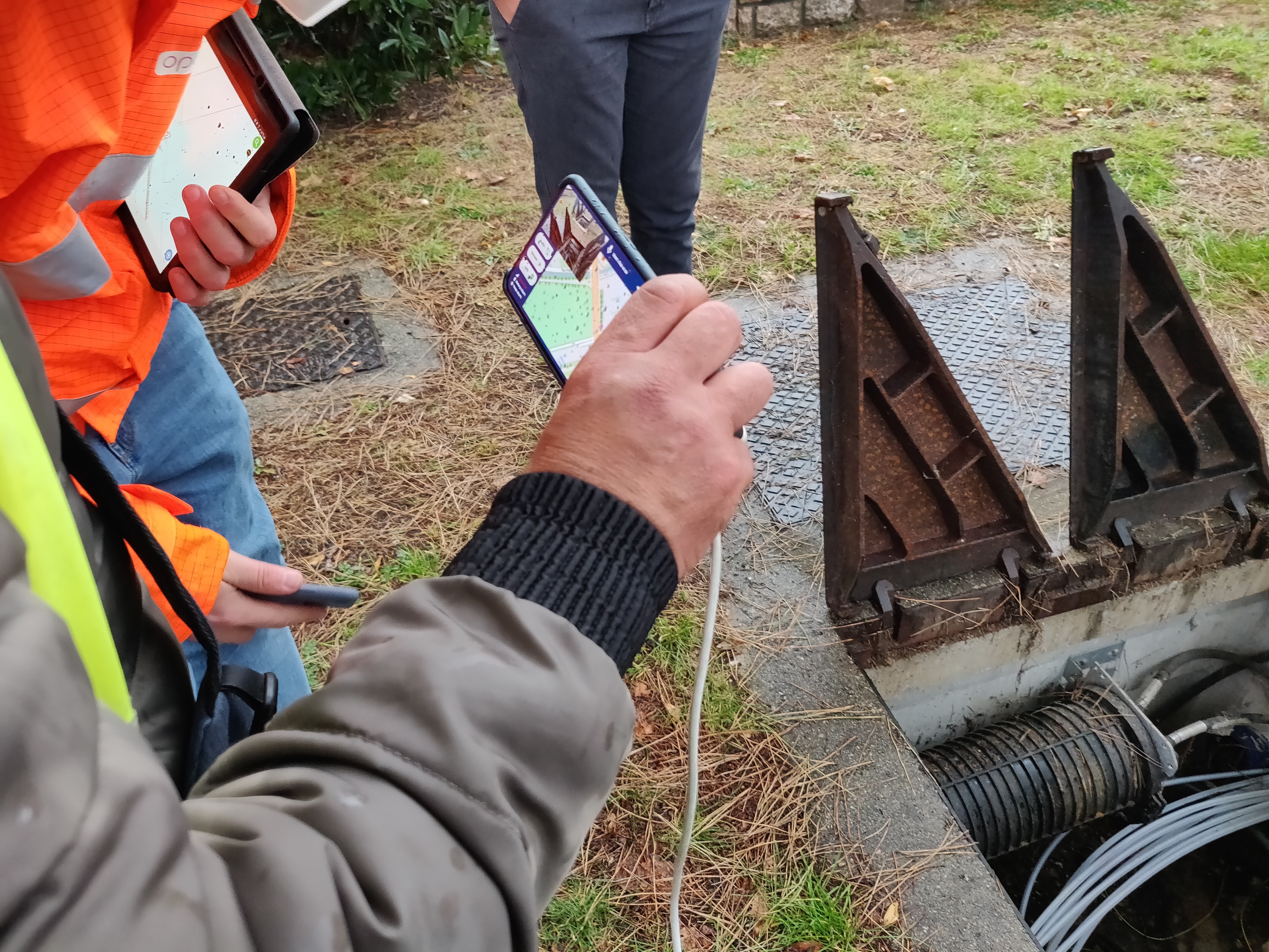 Qua vedete l'app, che fa da alternativa agli occhiali. A sinistra vedete il tablet del field manager con il progetto esecutivo. L'azienda esecutrice si è accorta in fase di sopralluogo che sulle mappe il pozzetto Tn Digit era segnato nel punto sbagliato e quindi sono state fatte correzioni.