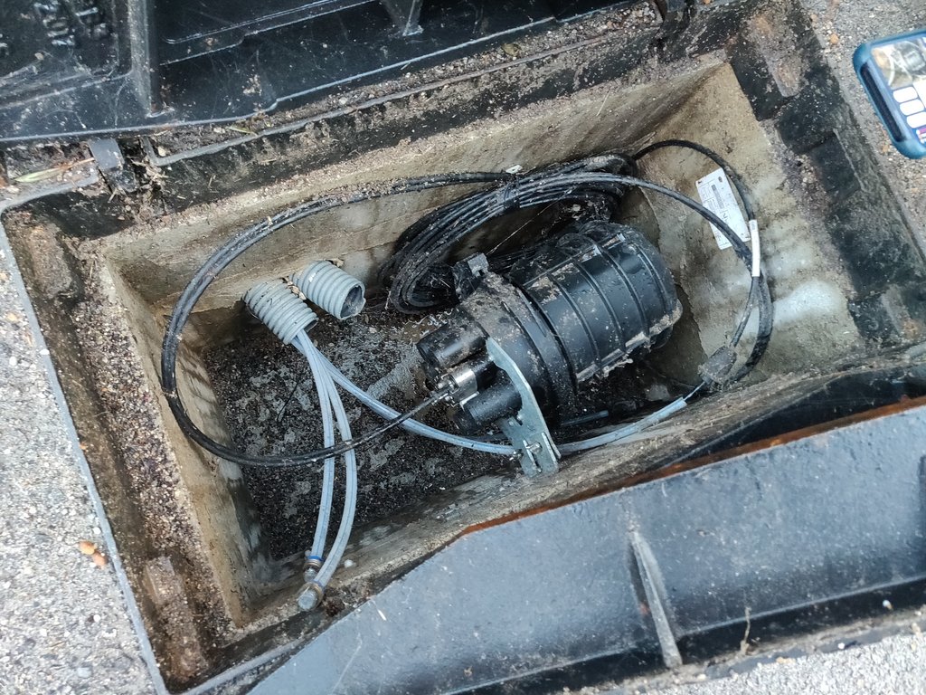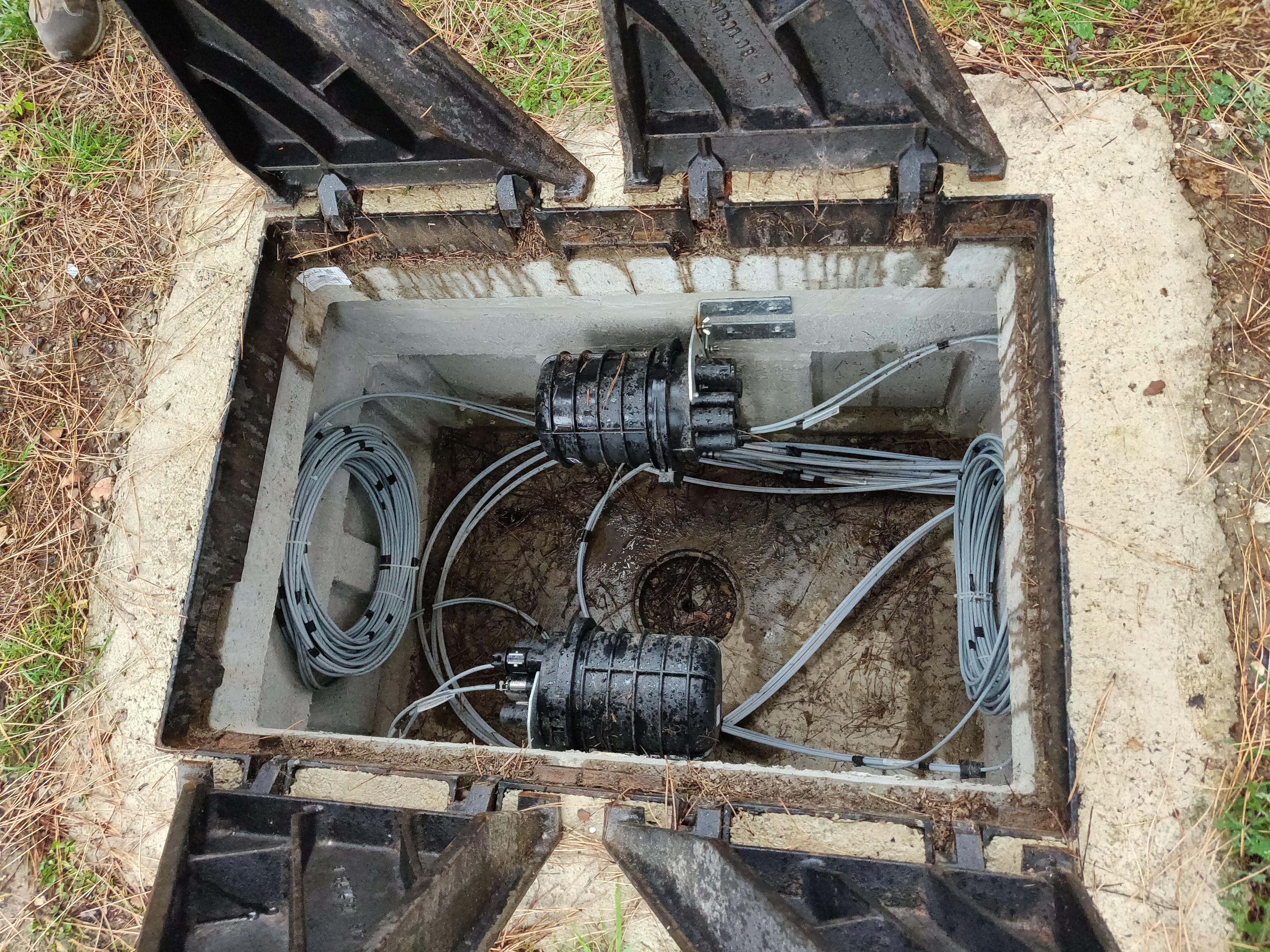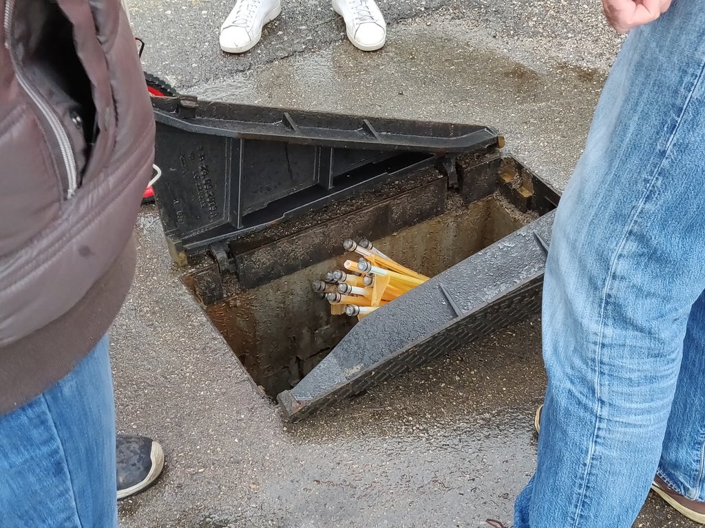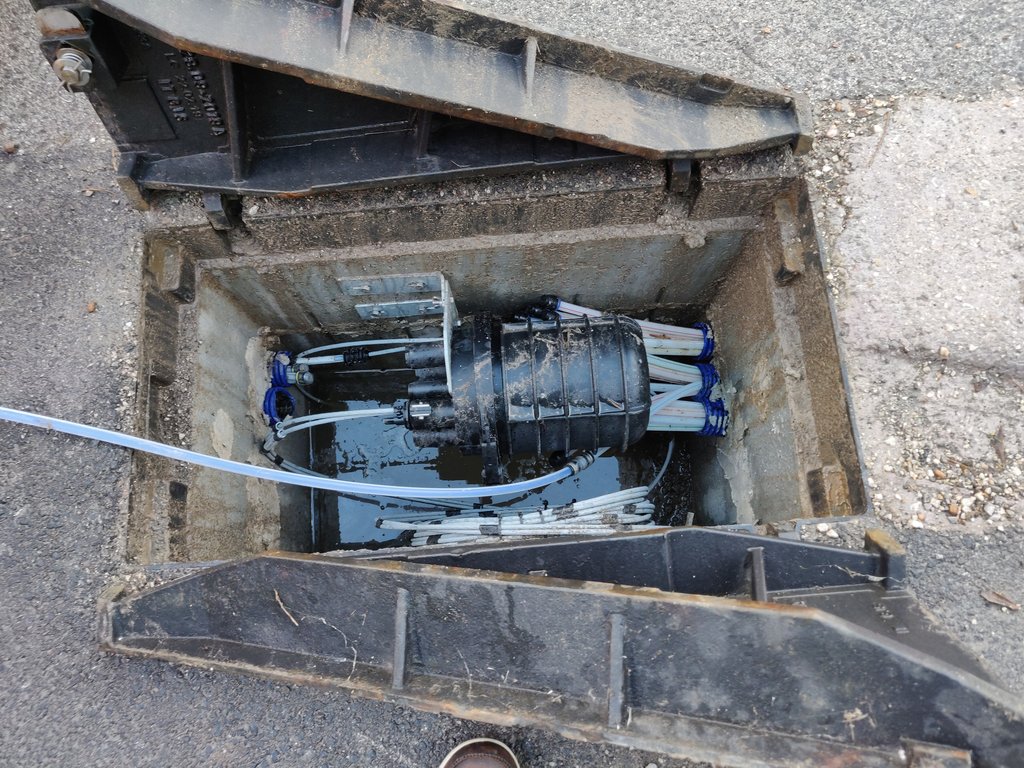 In basso a destra sulla sinistra vedete il cavo in fibra ottica della tratta primaria (che va verso il giunto comunale), mentre a destra si vedono i tubi per la fibra ottica già splittata che va verso i "ROE" e quindi verso le abitazioni.