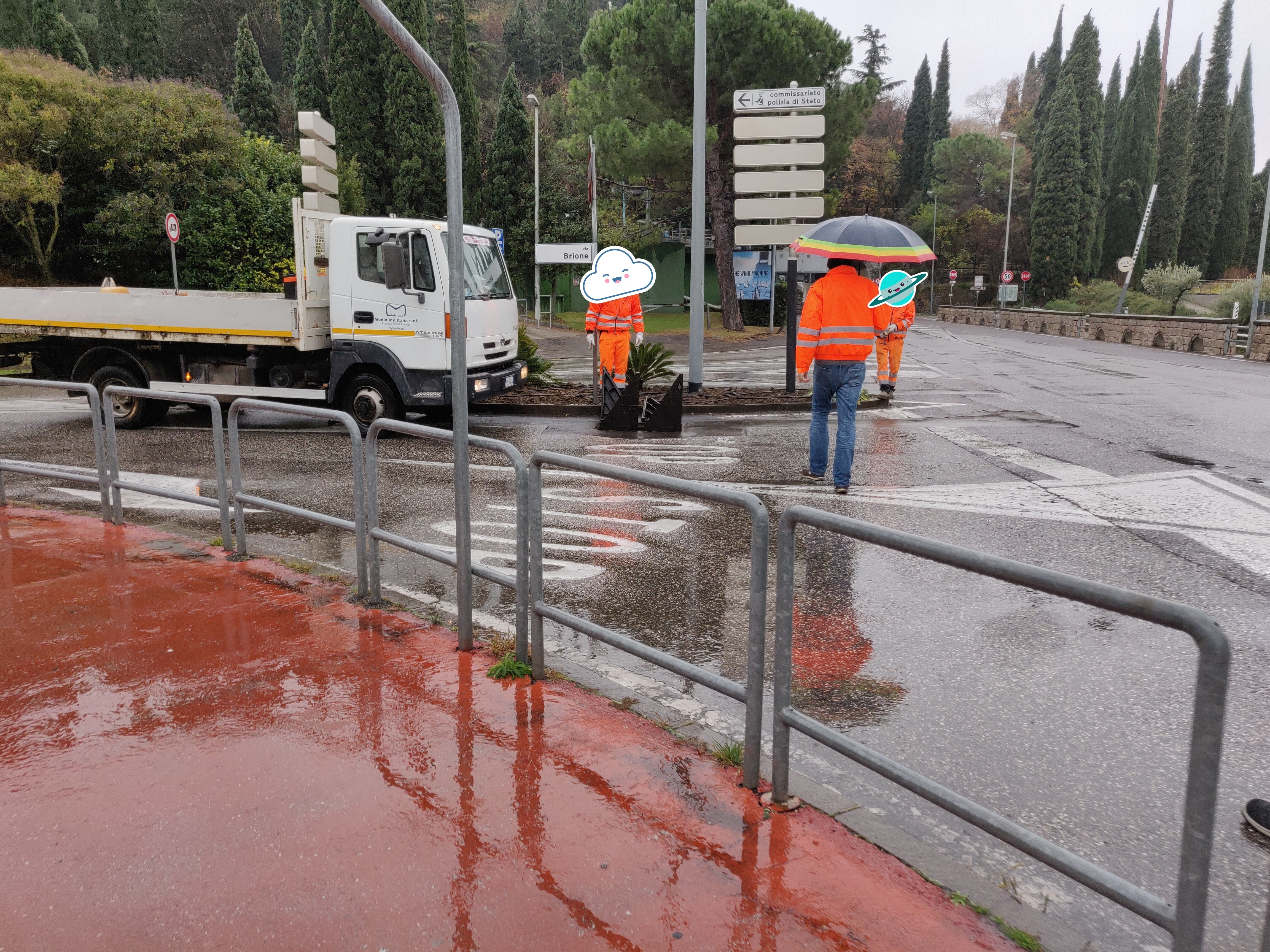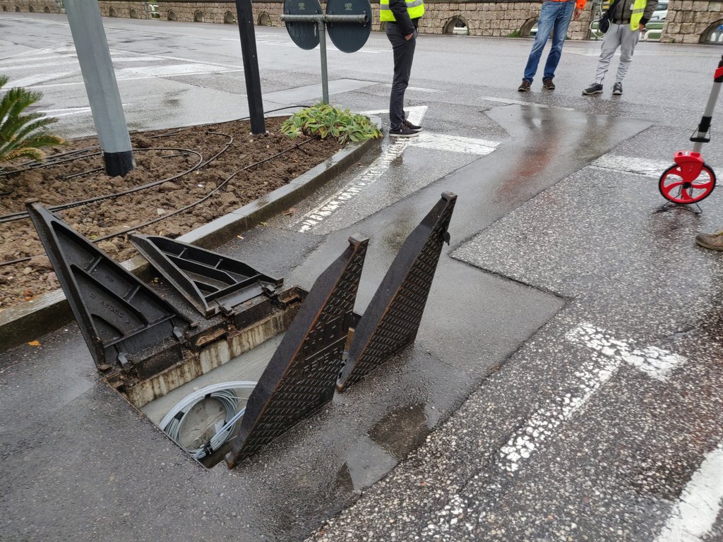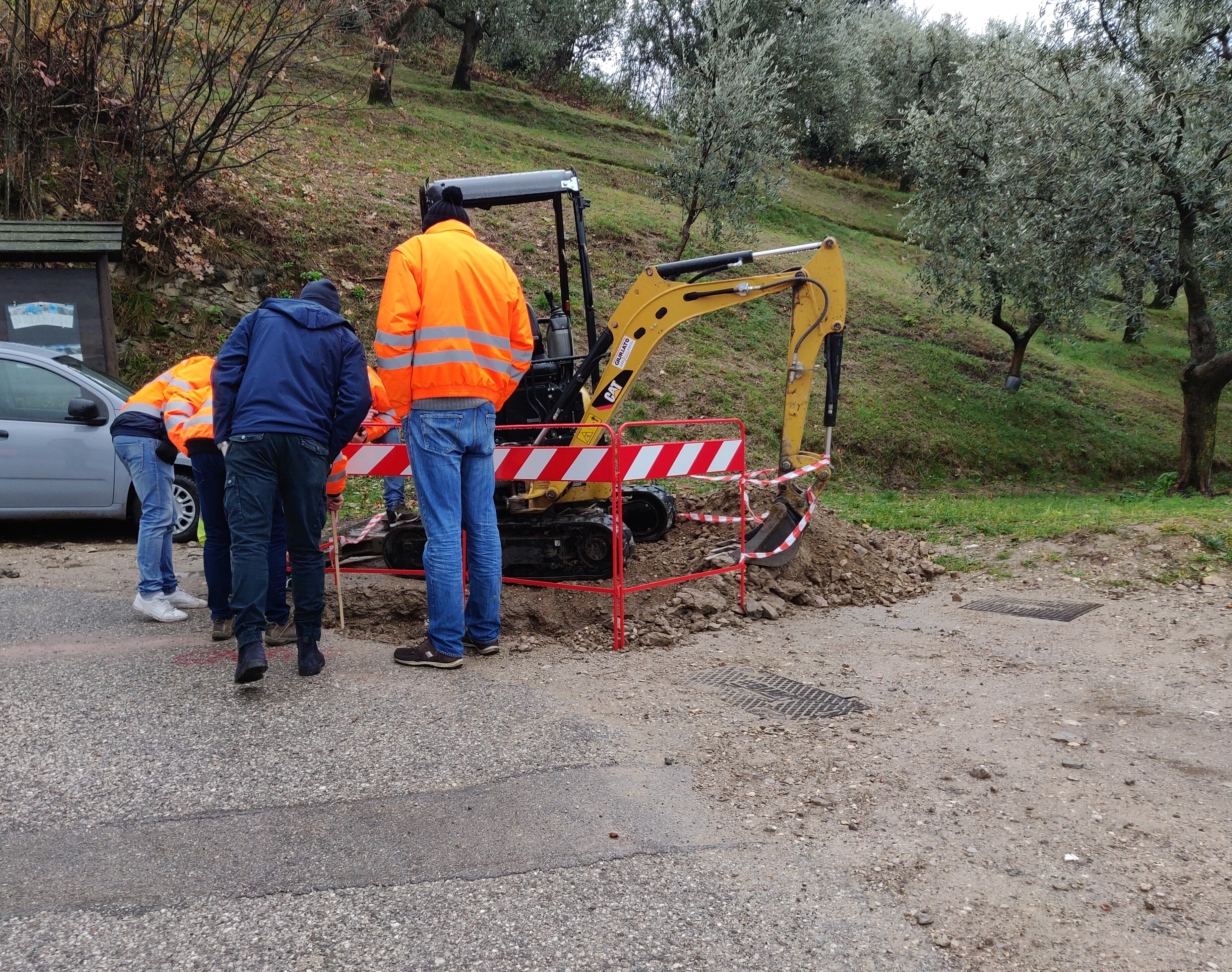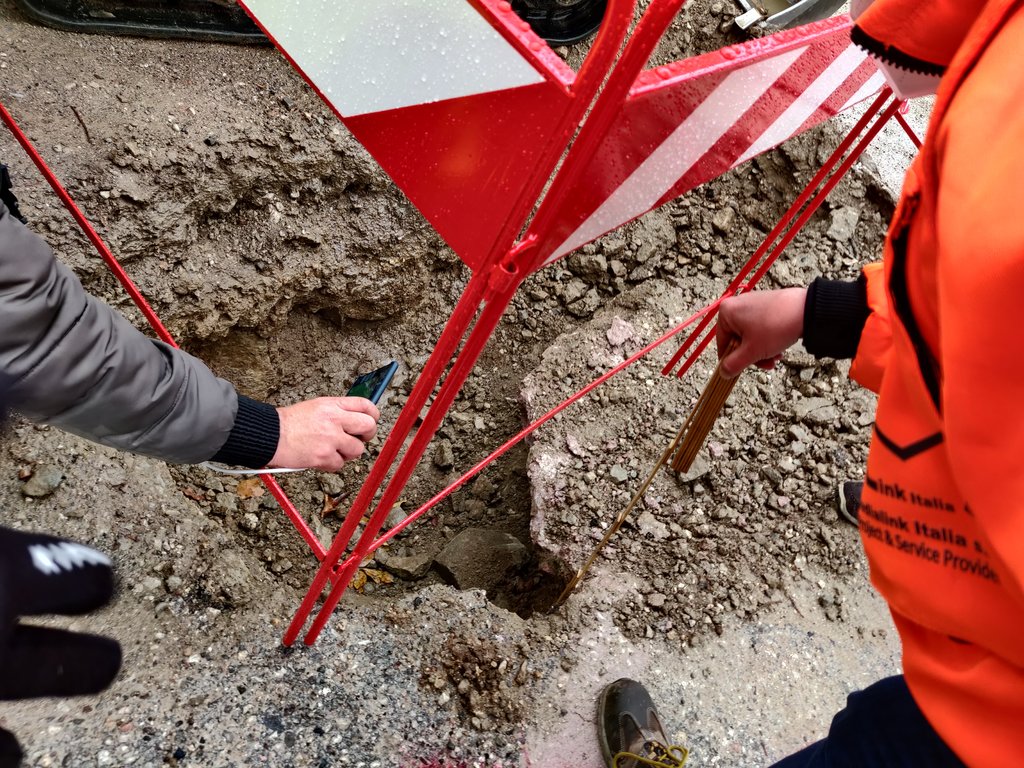 Un chilometro più in là c'è la "deviazione" per la terza BTS, che si trova sul Monte Brione. Qua non c'è il pozzetto Tn Digit, quindi è stato fatto uno scavo in mezzo alla strada per intercettare la fibra...