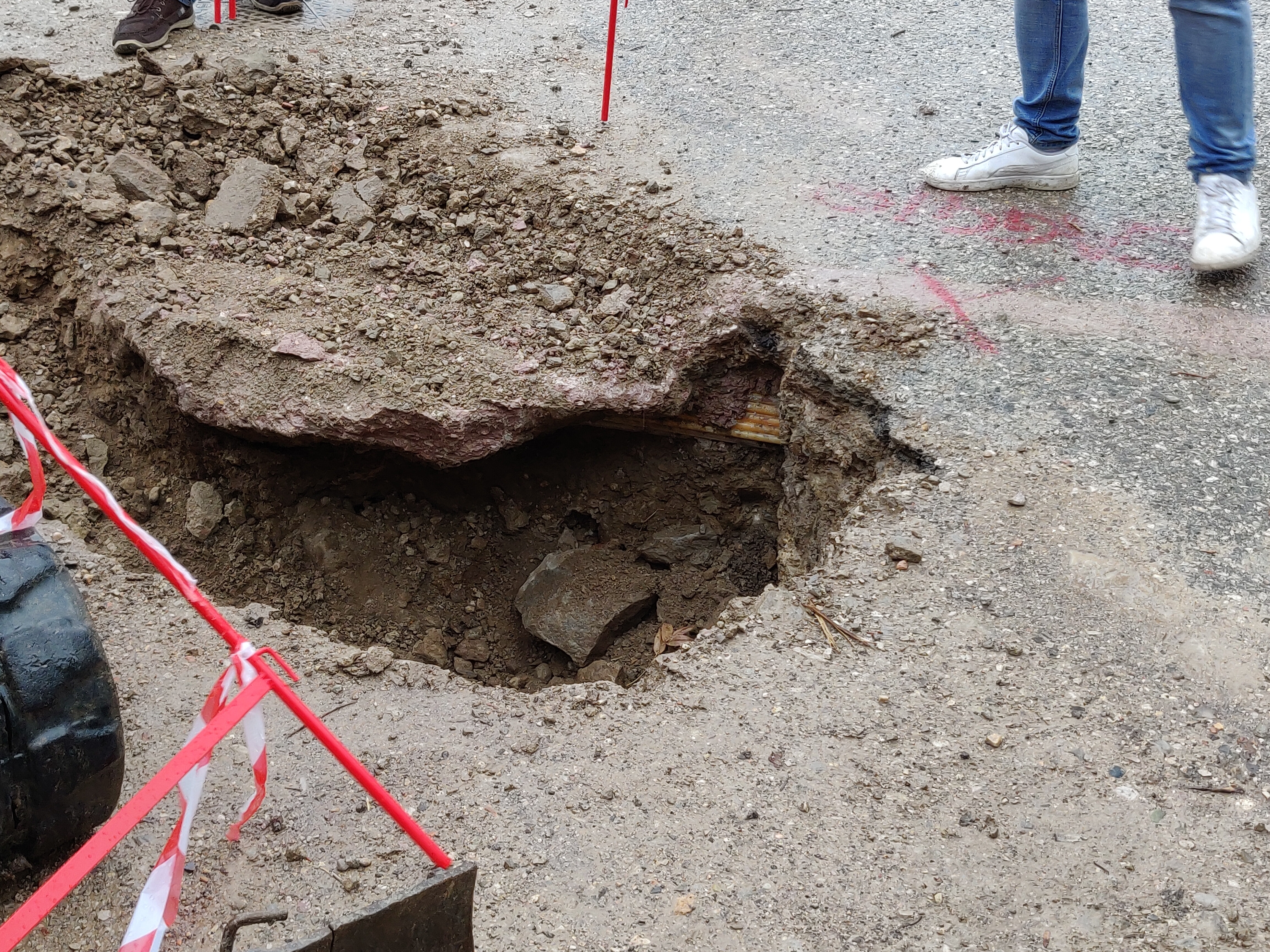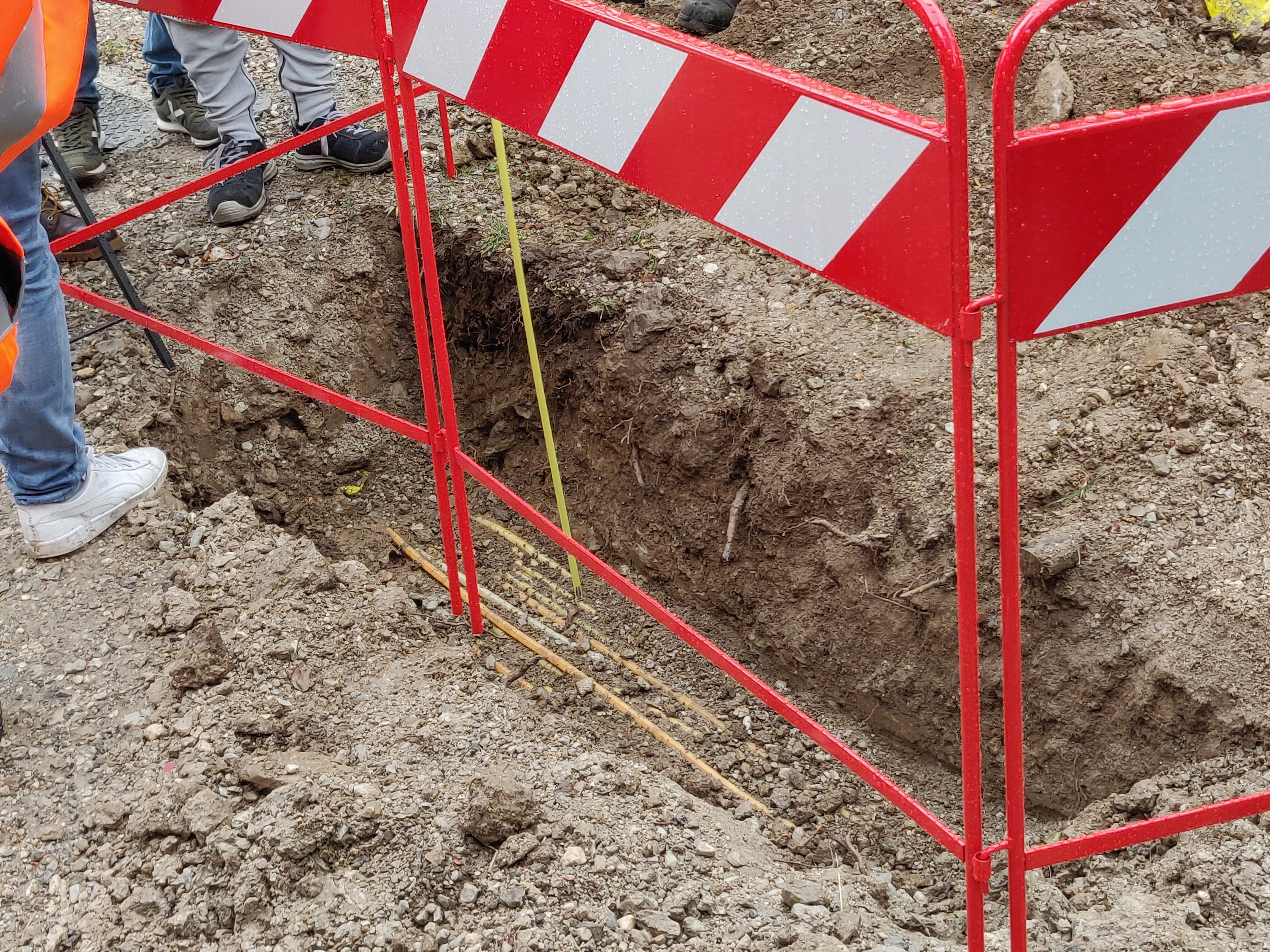 Secondo "saggio". Qua c'è un problema, non è stato possibile fare uno scavo dove c'era la minitrincea perché era in mezzo alla strada e il comune non autorizzava, per cui si è dovuto predisporre per l'indagine poco fuori dal tornante, vicino a un pozzetto.