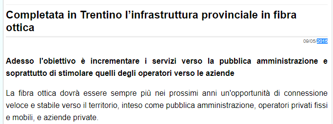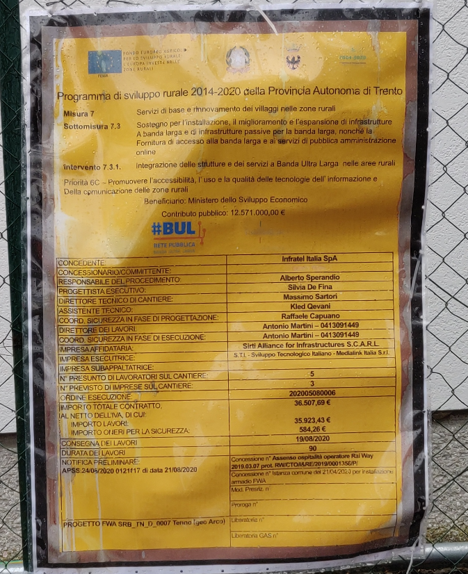 - il piano BUL in provincia è partito realmente solo a metà 2019, con gigantesco ritardo, dopo la firma della convenzione tra Infratel e provincia di Trento che ha velocizzato molte cose (ad esempio tramite le conferenze dei servizi e migliorando di alcuni processi come la trasmissione dei progetti solo in formato digitale)