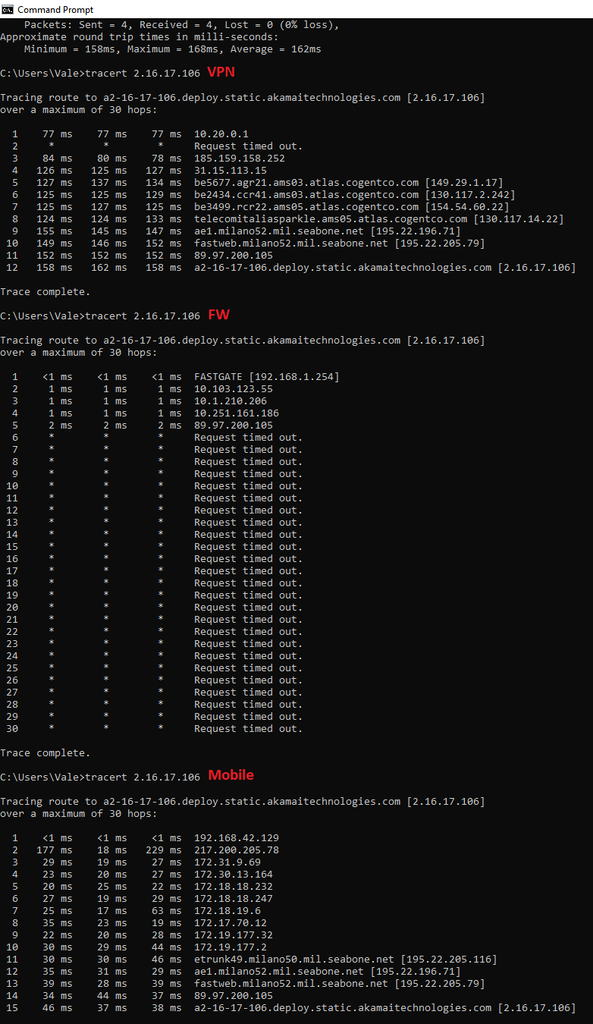 Quindi pensavo fosse un problema di routing verso l'ip di destinazione (Un CDN) ma dai traceroute sembra che neanche questo sia il caso