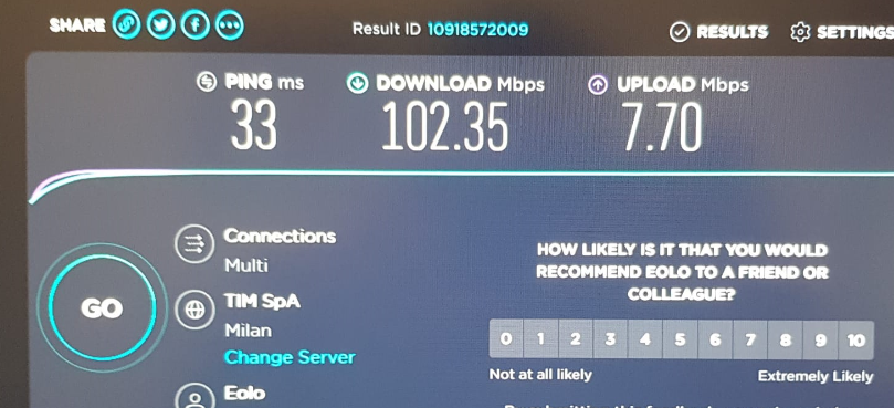 Mi ha rassicurato sulla stabilità del servizio, infatti non appena fatti i primi test il risultato è stato sorprendente, a detta sua oltre a quello che si aspettava. Vi allego uno speedtest fatto poco fa: