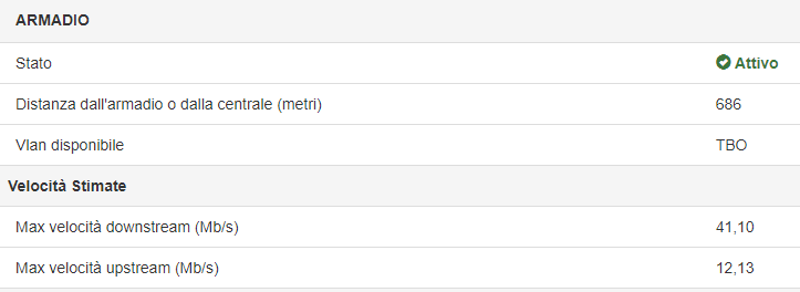 Controllando su fiber map conferma questi numeri e da vdsl attiva con velocità stimata 41 e rotti.