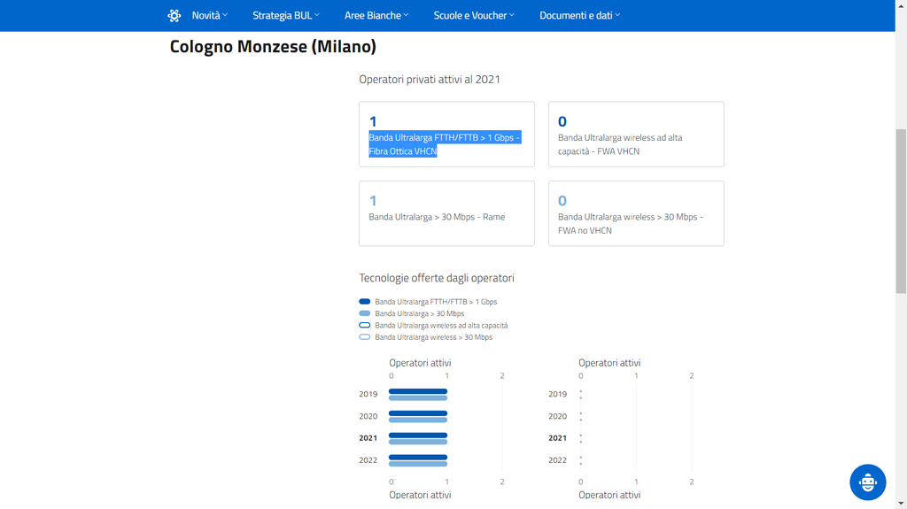 Vorrei sapere se qualcuno può fare chiarezza su un problema (?) sul sito di BUL. Che io sappia nel mio comune (Cologno Monzese) non c'è ancora nessun allacciamento in FTTH, o quantomeno sicuramente non nella mia via. Eppure sul sito di BUL il mio civico risulta coperto da un operatore in 'Banda Ultralarga FTTH/FTTB > 1 Gbps - Fibra Ottica VHCN' addirittura dal 2019.