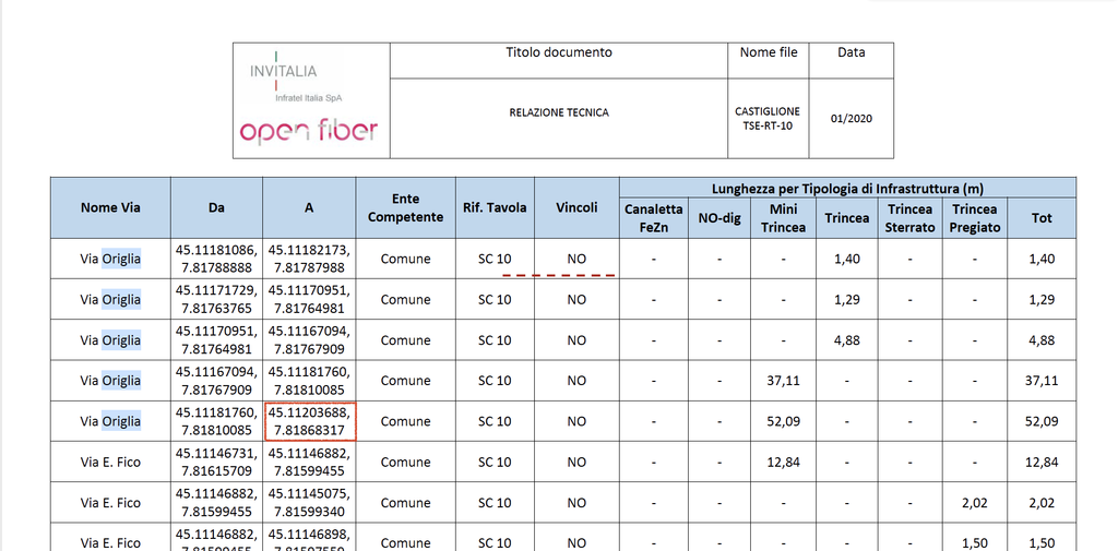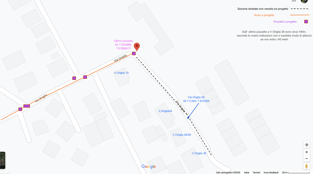 L’ ultimo pozzetto progettato sull’ esecutivo esposto a marzo scorso , risulta essere a queste coordinate (45.112037, 7.818683) mentre via Origlia 26 o comunque la sezione di strada non censita sul vostro progetto visibile tramite Google Maps a queste coordinate (45.111393, 7.819359).