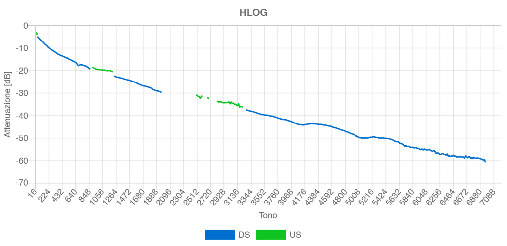 Al momento i valori di allineamento sono 147 in down (mi sono divertito a forzare l'snr) e 14 in up. Allego qua sotto un HLog: