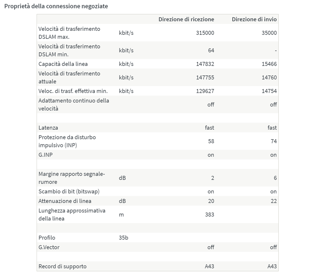 Salve, ho da settembre una 200 mega su SLU Fastweb, e all'inizio i valori di allineamento erano più o meno 115 mega in download e 30 in up (utilizzo un Fritz!Box). Per un mese e mezzo non si è mai disconnesso (prima con Wind si riconnetteva ogni notte), ma all'improvviso, dopo una riconnessione, l'upload scende a 14 mega, all'improvviso. Da quel giorno si riconnette ogni 1/2 giorni (non so se possa essere rilevante). Per il mese successivo ho chiamato e richiamato l'assistenza clienti, che finalmente manda un tecnico: il tecnico arriva (io non ero a casa ma c'era mia mamma) e dopo un po' va via dicendo che ha risolto. In realtà non aveva risolto niente, la situazione era tale e quale a prima. Segue un altro mese di chiamate in cui vengo letteralmente preso per il c*** con pratiche aperte e chiuse subito dopo che terminava la chiamata, ma dopo un po', non si sa per quale miracolo, mandano un altro tecnico. Stavolta il tecnico riesce a riportare l'upload a 30, e viene a casa mia per verificare che tutto funzioni, dicendomi che il problema era la permuta dell'armadio. La velocità di download era scesa a 100 circa, ma d'altronde avevo di nuovo i 30 mega in upload, ed era l'importante visto che ho bisogno di caricare molti file.