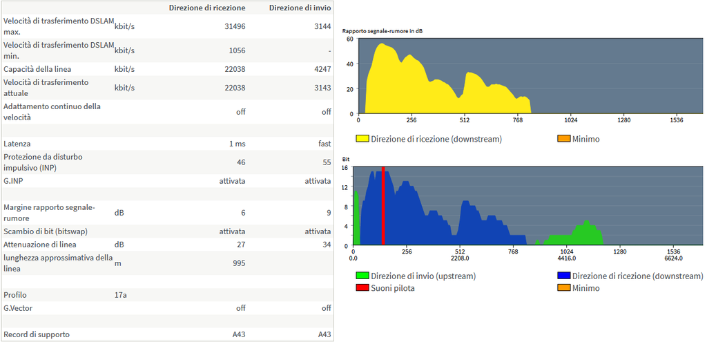 La velocità di trasferimento dslam max è al momento solo di 31.5/3.1 mbit/s, però inizialmente a modem appena installato era di 100/20, quindi immagino che la velocità max sia stata ridimensionata a seguito del fatto che la linea a più di 20-22 mbit/s realmente non va.