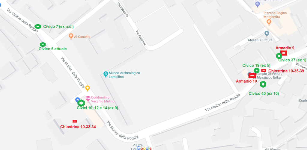 L'armadio 10 confermo è all'attuale civico 5 circa, molto vicino (circa 30 metri a occhio, dal vivo, non da gmaps) al 9 che è all'incrocio tra via roma e via molino della roggia.