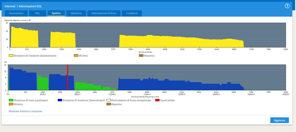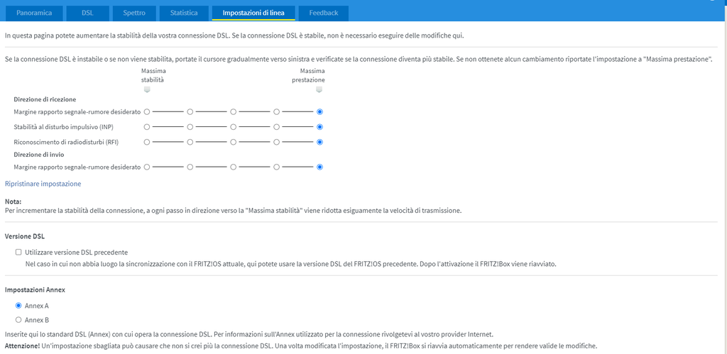 SalvatoreLentini QRDG Ok provo con annex B. ho letto che migiora anche utilizzare i driver dsl precedenti è vero ? Dopo 4 giorni di uptime non vedo nessun errore. Snr la abbasso con fbeditor ? ma se io abbasso l'snr poi automaticamente non mi risale a 6 ?