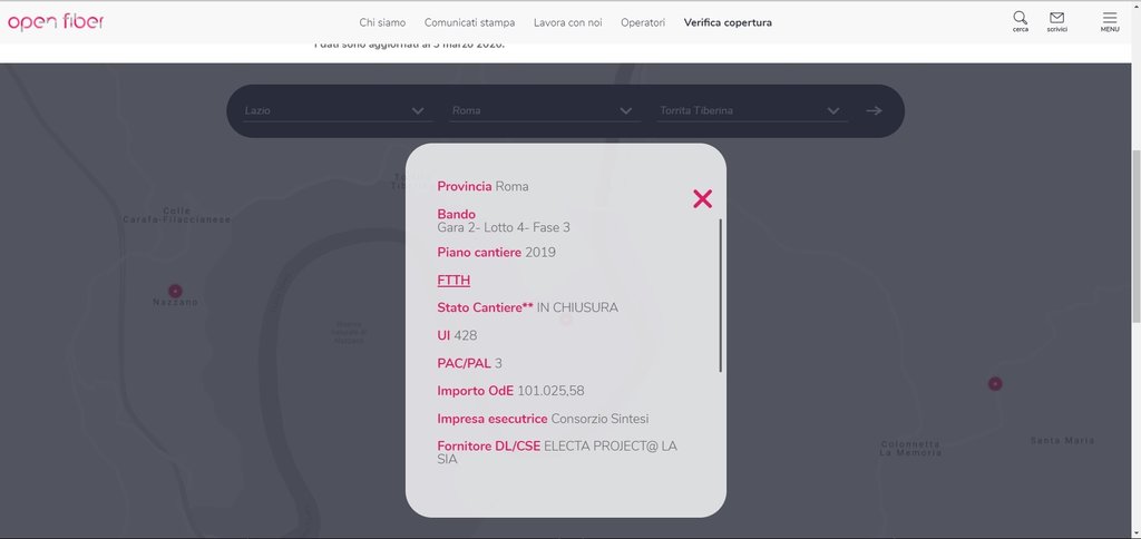 Alex_96 Ora il mio comune risulta in chiusura,è rimasto mettere la fibra nei minitubi,alcuni pozzetti mancanti,i ROE,portare la fibra alle BTS ed infine installare gli armadi e devono fare tutto entro fine anno.