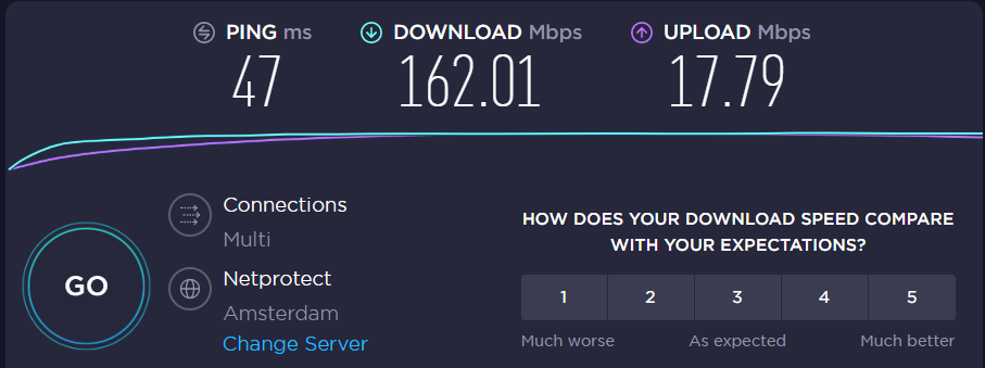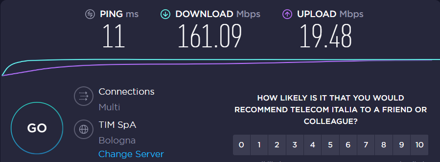 Questa ad esempio è un'ottima linea, i risultati dello speedtest sono circa uguali tra amsterdam e bologna.