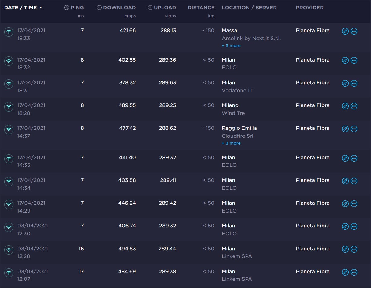 Invece se provo su speedtest (sempre verso eolo) non raggiungo mai i 500Mb di download (mentre di up son sempre a quasi 300) anzi in genere fatica a superare i 400Mb.