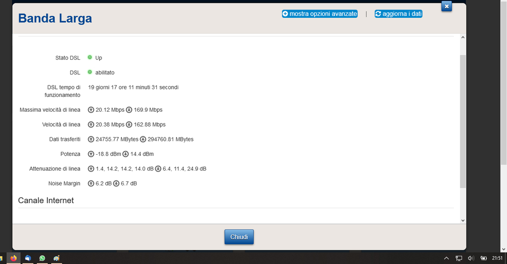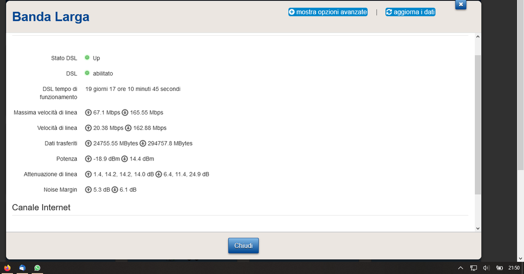 Ciao a tutti, ieri stavo sistemando alcune impostazioni sul mio tim hub quando ad un certo punto mi sono accorto che la portante agganciata in up è passata molto velocemente dai soliti 20-21 Mbps a 80Mbps (ovviamente la velocità è sempre rimasta a 20). Inizio a refreshare la pagina e quasi in contemporanea inizia a calare vistosamente il download, passando dai normali 150Mbps fino a scendere a circa 3-4 Mbps. Tengo monitorato ancora qualche minuto refreshando la pagina e piano piano la portante in down torna a salire fino a stabilizzarsi ai soliti valori (forse qualcosina di più, ora sto a 160Mbps). In tutto questo la portante non è mai caduta. Decido quindi di andare a vedere l'INP per vedere se avessi l'SOS attivo e scopro infatti che il valore in down è 95.