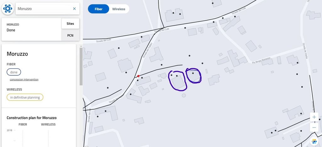 Screenshot sito bandaultralarga, le case interessate sono cerchiate in blu, il tombino BUL è il pallino rosso e alla destra del pallino parte il pezzo di strada privata: