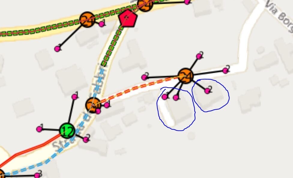 Questo è il progetto esecutivo che mi è stato inviato da Infratel, le case sono cerchiate in blu e il pallino arancione sulla strada privata con i vari collegamenti dovrebbe essere il PTA: