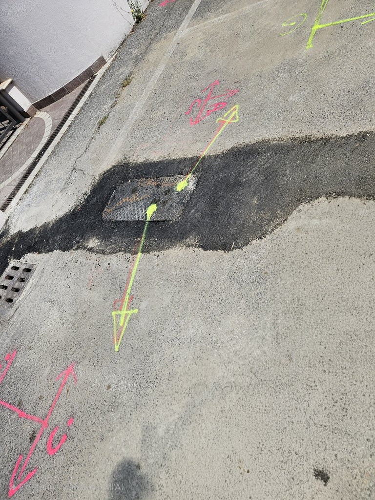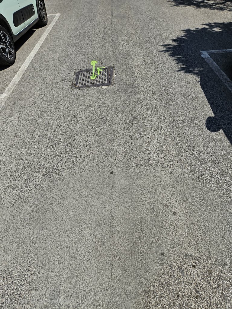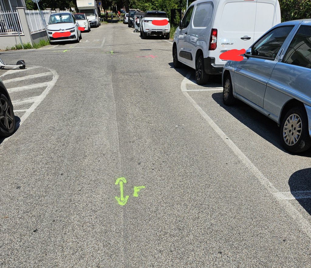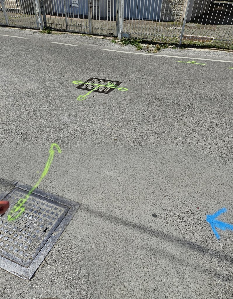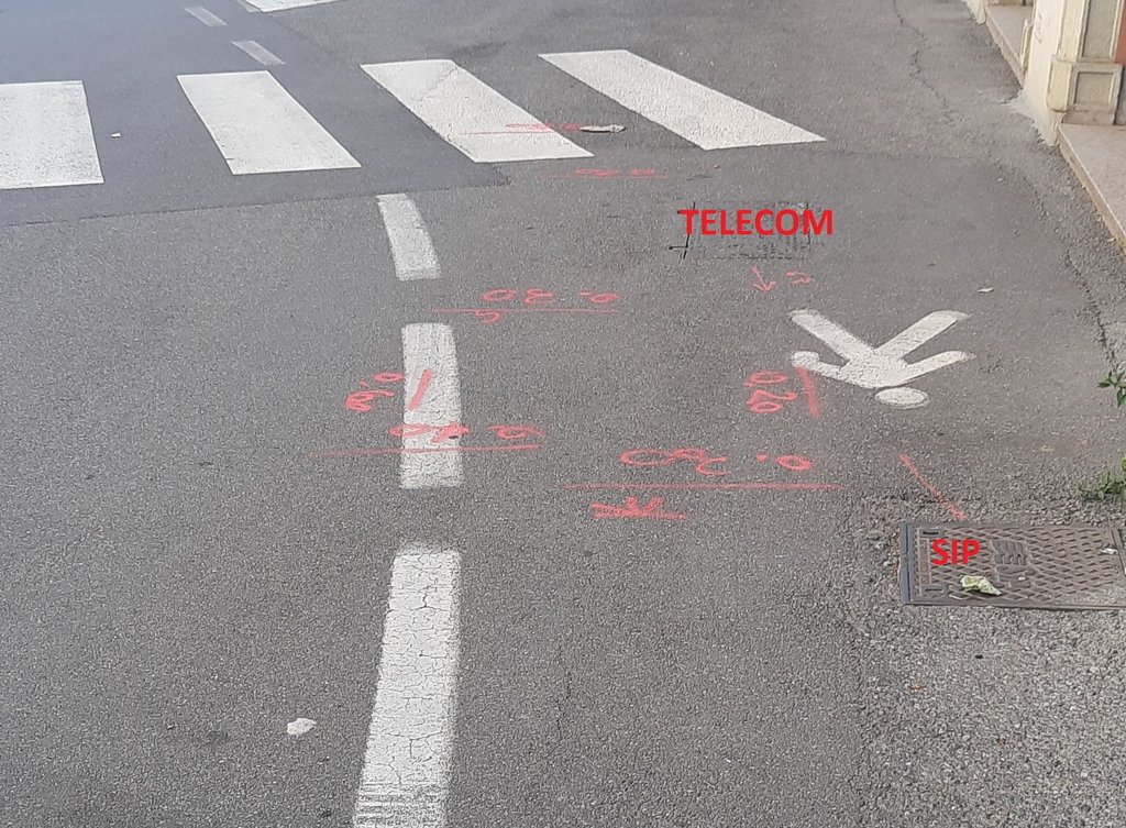 Colgo l'occasione anche per chiedere cosa indichino queste scritte sull'asfalto, fatte sempre dai tecnici. Non credo degli scavi perché lo scavatore è sempre rimasto parcheggiato dove hanno svolto i lavori, e oggi lo hanno portato via insieme ai cartelli che segnalavano i cantieri.