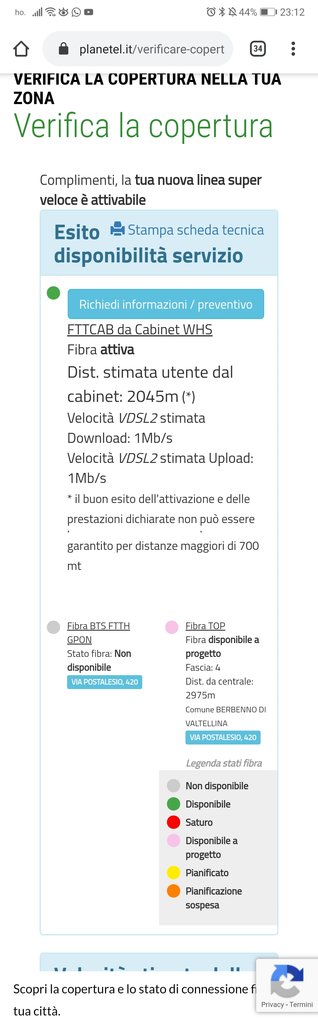 Allora la situazione è questao ora: la mia via è lunga circa 1km.. All'inizio e alla fine ci son due cabinet, all'inizio della via e alla fine hanno la fttc tim e io e pochi altri in centro non possiamo attivarla da sito tim ma come copertura mi da ancora adsl.