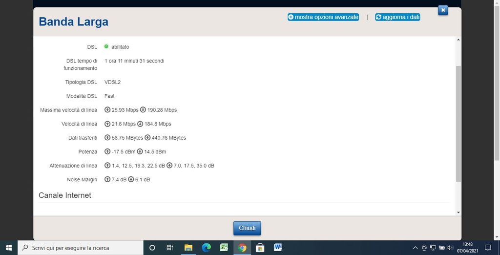 Preciso che il modem è collegato alla presa principale, l'impianto di casa non dovrebbe avere derivazioni e disto 179 m dal cabinet (secondo Fibermap).