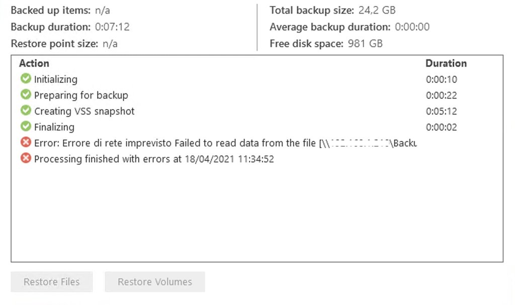 18/04/2021 11:34:47 :: Error: Errore di rete imprevisto Failed to read data from the file [\<ip_add>\Backup\Veem\Job\Job2021-04-17T161717.vbk]. Failed to restore file from local backup. VFS link: [summary.xml]. Target file: [MemFs://frontend::CDataTransferCommandSet::RestoreText_{fa4e6400-648d-48f9-b615-e71af77b806f}]. CHMOD mask: [0]. Agent failed to process method {DataTransfer.RestoreText}. Agent failed to process method {DataTransfer.RestoreText}.