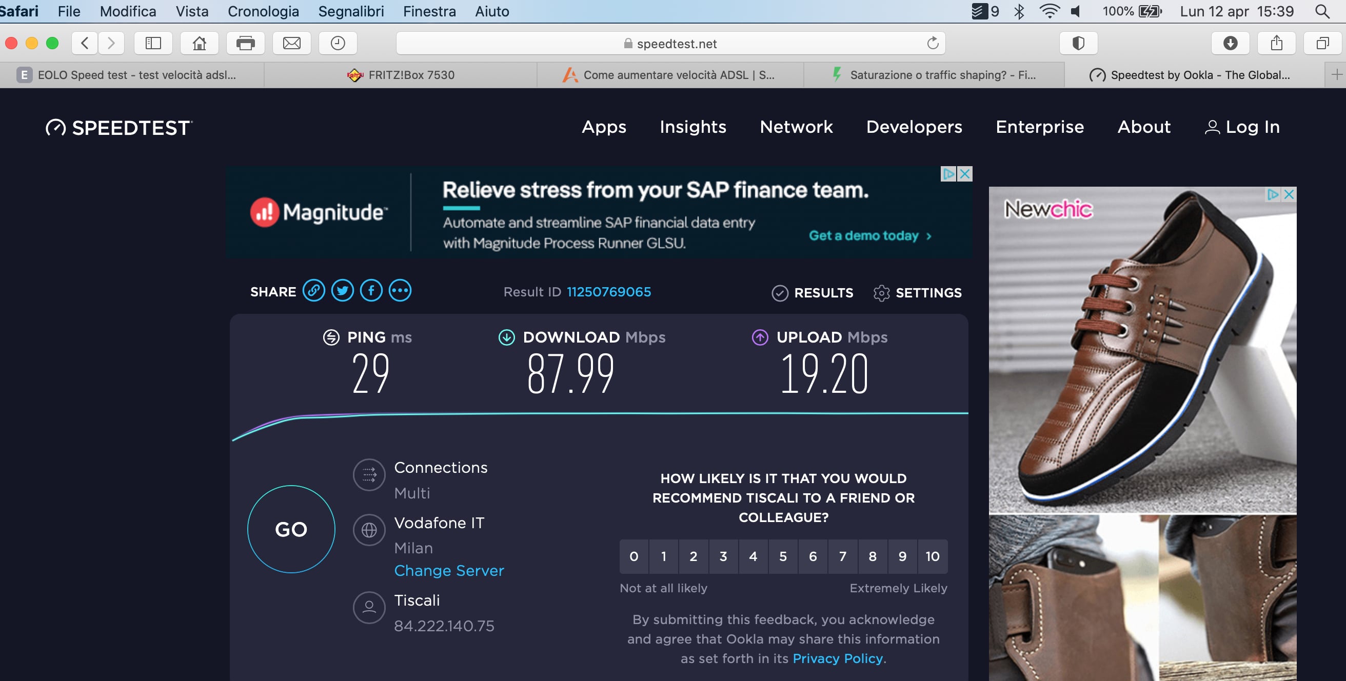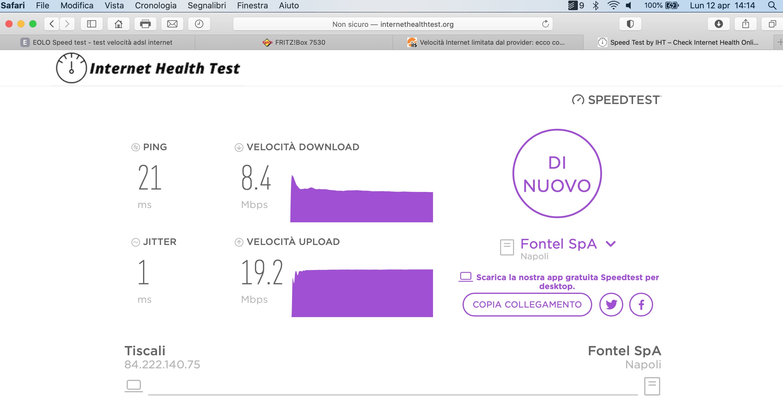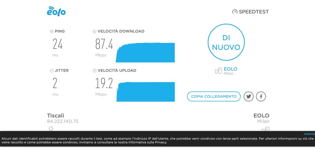 Tuttavia noto una cosa, ossia che la navigazione non è assolutamente cambiata rispetto a prima. Infatti se faccio lo speedtest Okla mi ritrovo valori che pochissimo si discostano da quelli adsl: 10mb al massimo in down e 19 in up. Però se lo faccio con Eolo speedtest i dati cambiano e arrivo effettivamente a 88mb in down.