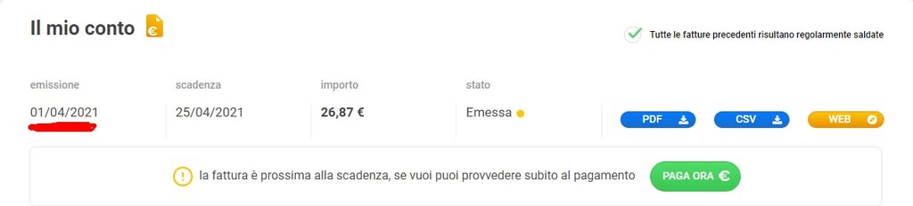 Arriva la terza fattura in cui c'era allegato il bollettino precompilato: €26,87. Strano che non ci fossero stati quei €100 in piu'... mi reco in tabaccheria per pagare il bollettino avendo la ricevuta di avvenuto pagamento. Arriviamo ad oggi e dopo una settimana lo stato della fattura e' ancora "Emessa"