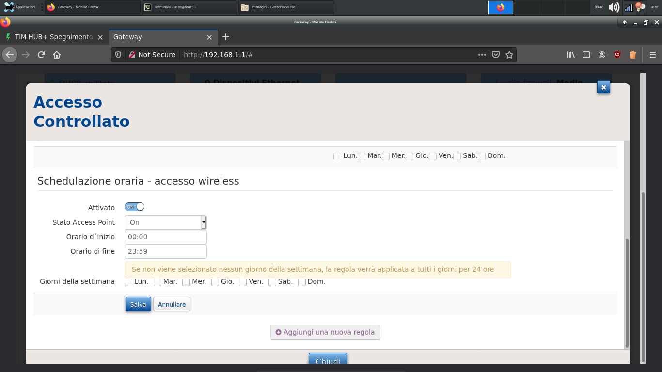 Buongiorno a tutti, possiedo un tim hub+ techicolor, aggiornato alla versione AGTHF_1.0.2, e ho un problema con l'accensione/spegnimento pianificata del wifi.