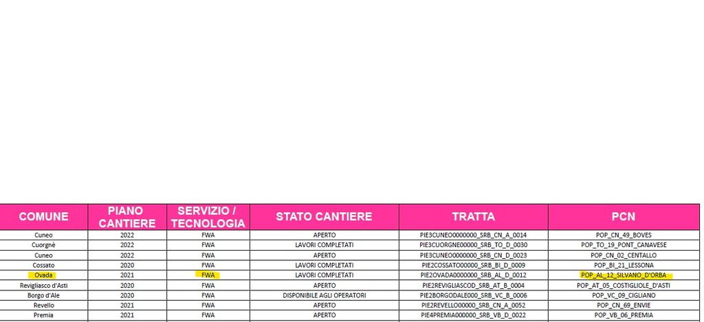 L'FWA di Ovada, da quello che ho visto, è aggangiata al PCN di Silvano D'orba che dal sito BUL risulta molto indietro, ma a sto punto non so se pensare che sia corretta anche questa info.