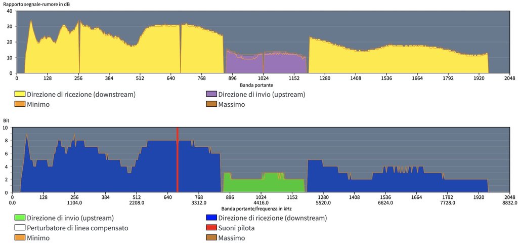Ma, esiste una maniera per almeno tornare ad avere una 50ina di Mbit? Come risolvo le due deviazioni? I buchi nella portante sono difetti del cavo? Perché TIM mi disse 60Mb e adesso ne ho 25?