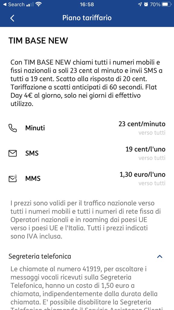 Incuriosito dalla cosa ho provato a verificare se fosse possibile avere la stessa cosa sul mio numero Tim, chiamando la segreteria 41919 mi dava errore, allora sono andato a verificare e risulta che la Segreteria Telefonica base risulta gratuita