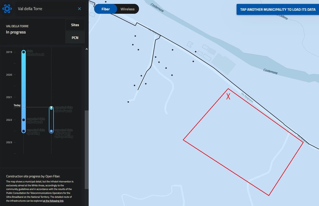 qui a Val della Torre è presente un problema che è stato già affrontato su questo forum diverse volte, ossia quello del civico non censito da Open Fiber, con l'aggravante che riguarda un intero gruppo di abitazioni adiacenti alla mia e allo scavo della fibra.