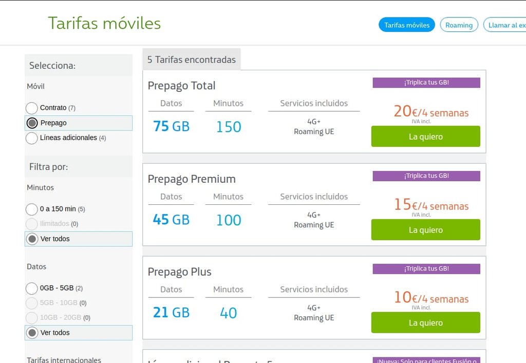 El periodo de disfrute de la promoción será de 4 semanas desde el instante de la contratación o renovación de la Tarifa Prepago. Válido para contrataciones y renovaciones de tarifa del 11 de mayo de 2021 al 30 de septiembre de 2021 (ambos incluidos). Una vez finalizada la promoción y el periodo de disfrute de la misma, se dejará de disponer automáticamente de los GB ofrecidos en el bono promocional, sin que el cliente necesite realizar ninguna gestión.