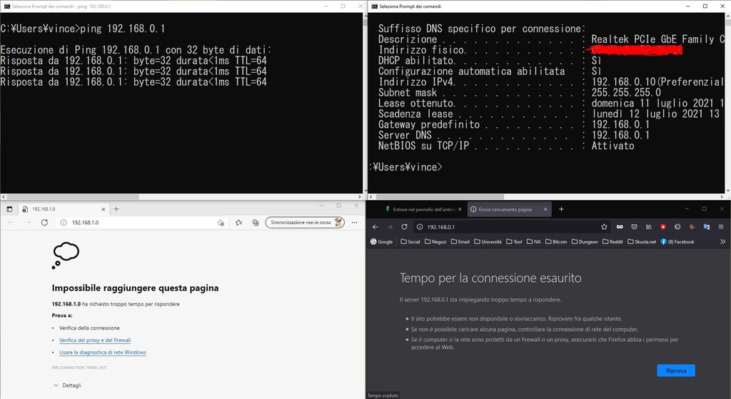 Ho provato come hai detto tu, ho staccato il cavo lan dalla porta WAN della mia vodafone power station e l'ho attaccato al pc, ho digitato l'infirizzo ip da te suggerito ma nulla. Ho poi controllato da cmd, treamite ip config, l'indirizzo di gateway predefinito e mi suggeriva 192.168.0.1 (come da screen). Nel dubbio ho ripetuto più volte il test anche dopo aver staccato l'alimentazione all'antenna, su entrambi gli ip ma nulla... Ho notato poi che potevo pingare 192.168.0.1 ma da browser nessuna traccia del pannello