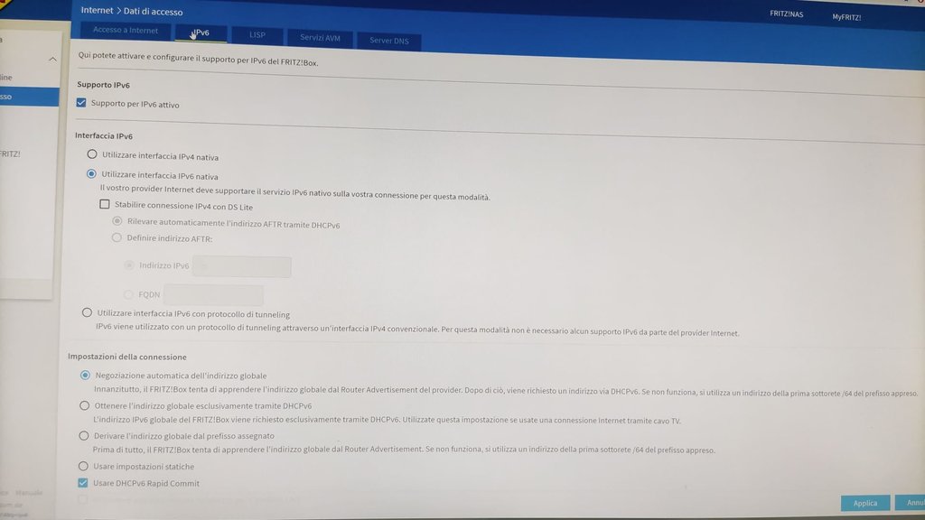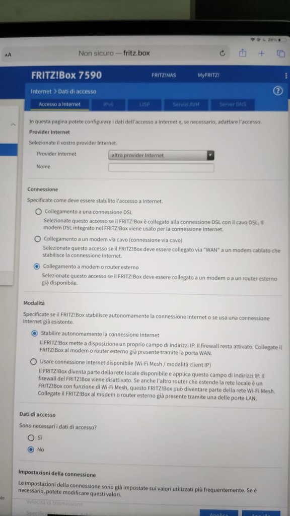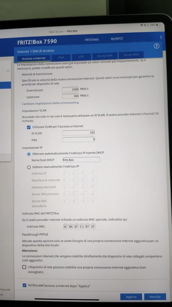 sto cercando di configurare a mio suocero la connessione (ha Sky Wifi) eliminando lo sky hub ed utilizzando quindi il suo FritzBox 7590. Ho seguito la configurazione consigliata su sito Sky ed in parallelo la configurazione di un utente qui sul forum replicandola in toto, tuttavia la connessione non funziona, nel senso che non viene assegnato nemmeno un ip pubblico.